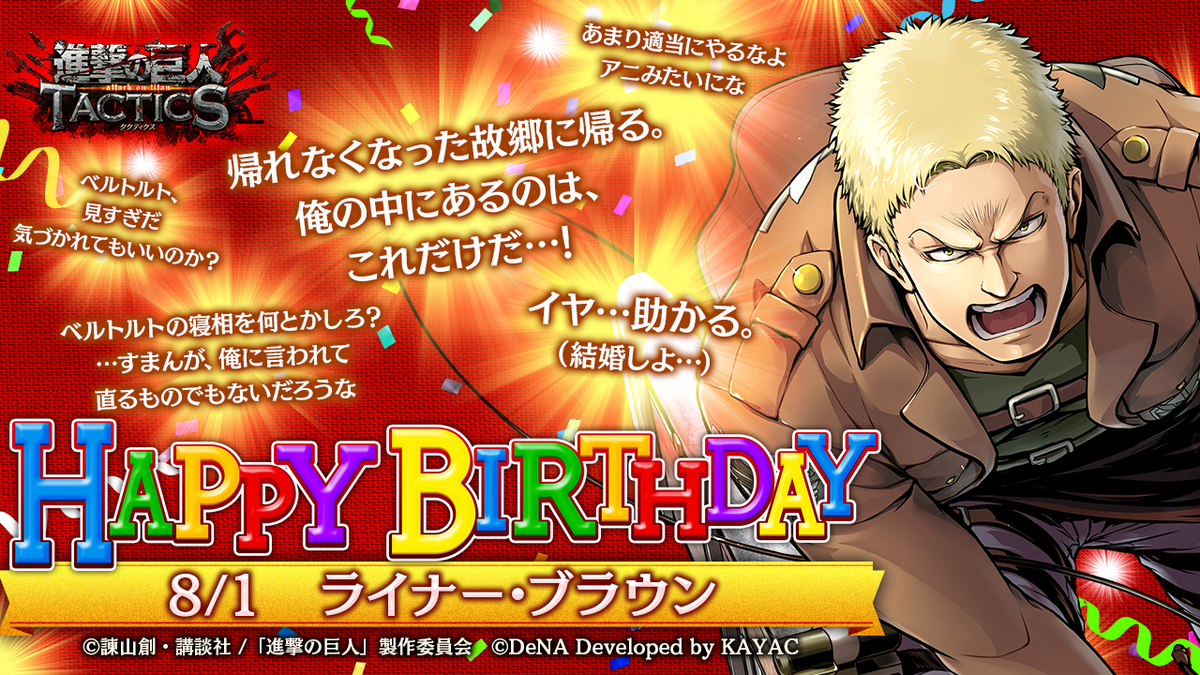 ゲキタク 進撃の巨人tactics公式 Twitterren 8 1はライナーの誕生日 おめでとうございます ベルトルトと同郷で 故郷 へ帰るという強い思いを持つライナー ゲキタク では8 1 土 のログイン時に 誕生日専用のセリフとともに プレゼントをお贈りいたします
